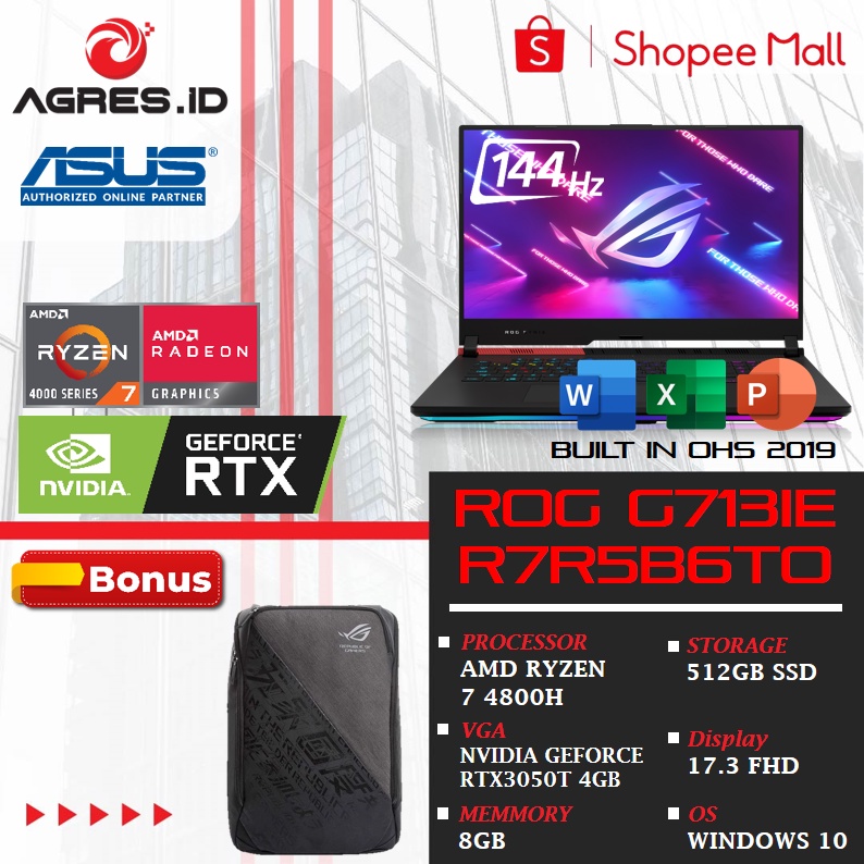 Kelebihan membeli Asus ROG G713IE R7R5B6TO Ryzen 7 4800 RAM 8GB 512GB SSD RTX3050Ti W10+OHS 17.3 FHD 144Hz